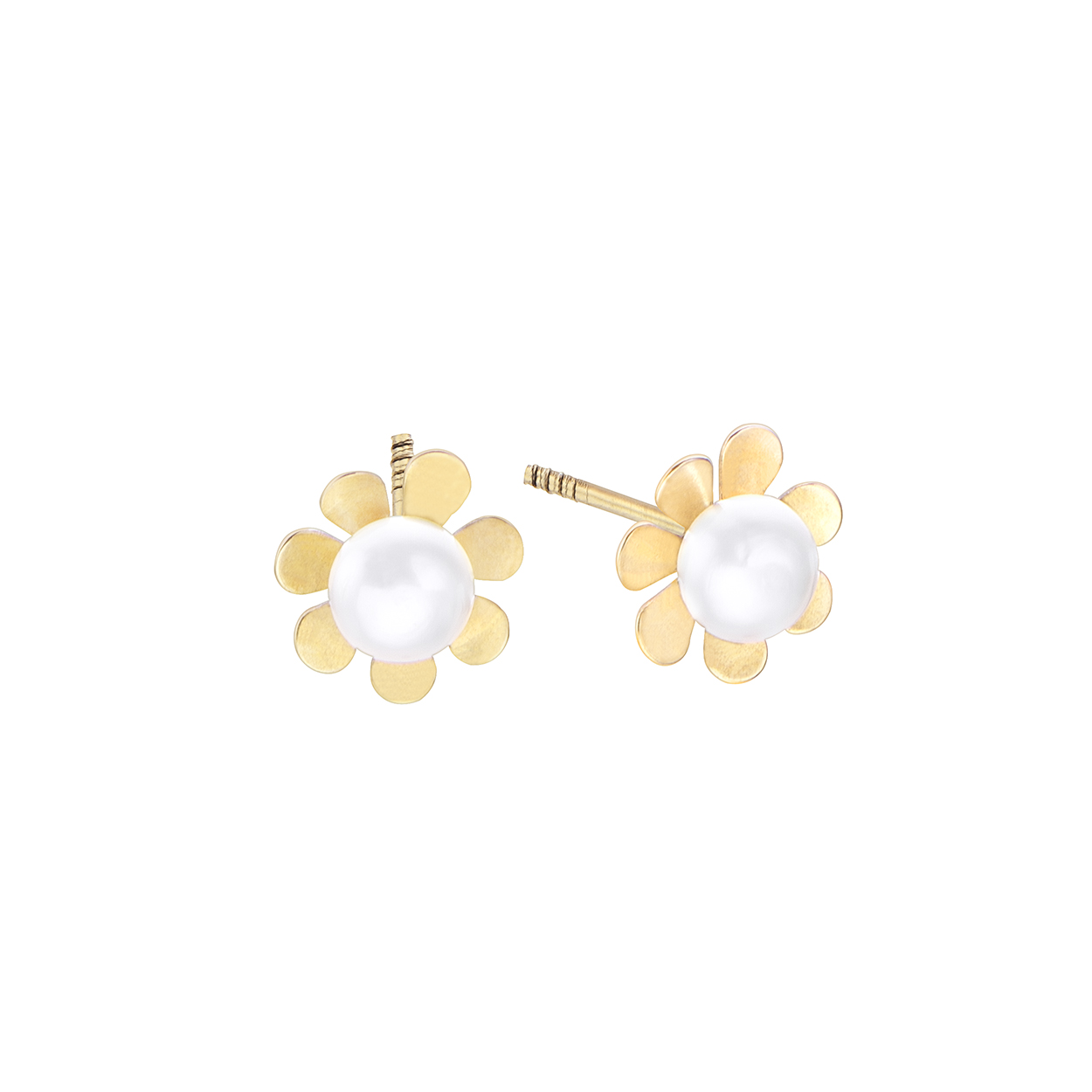 Pendientes Durán Exquse de la colección Kids and Baby realizado en oro amarillo 18k perla con bisel en flor de 7 petalos, diametro 6 mm