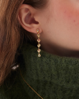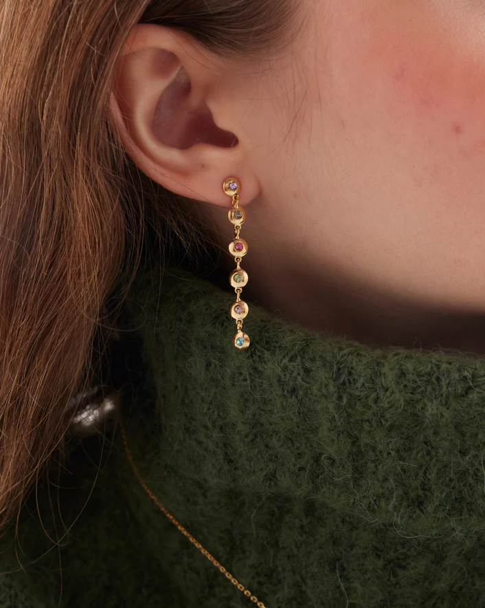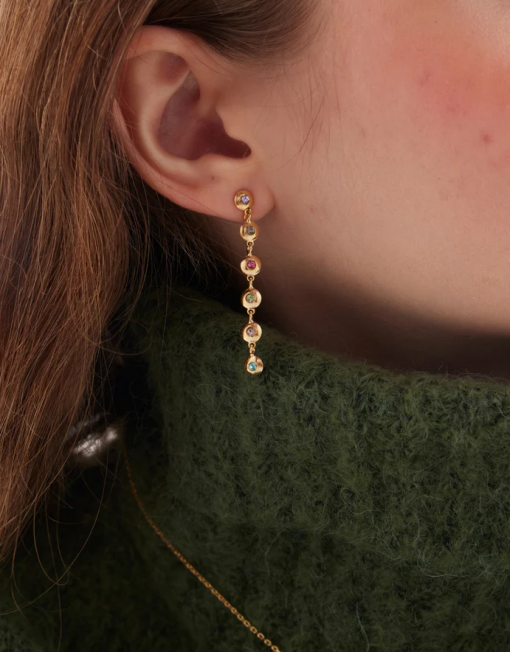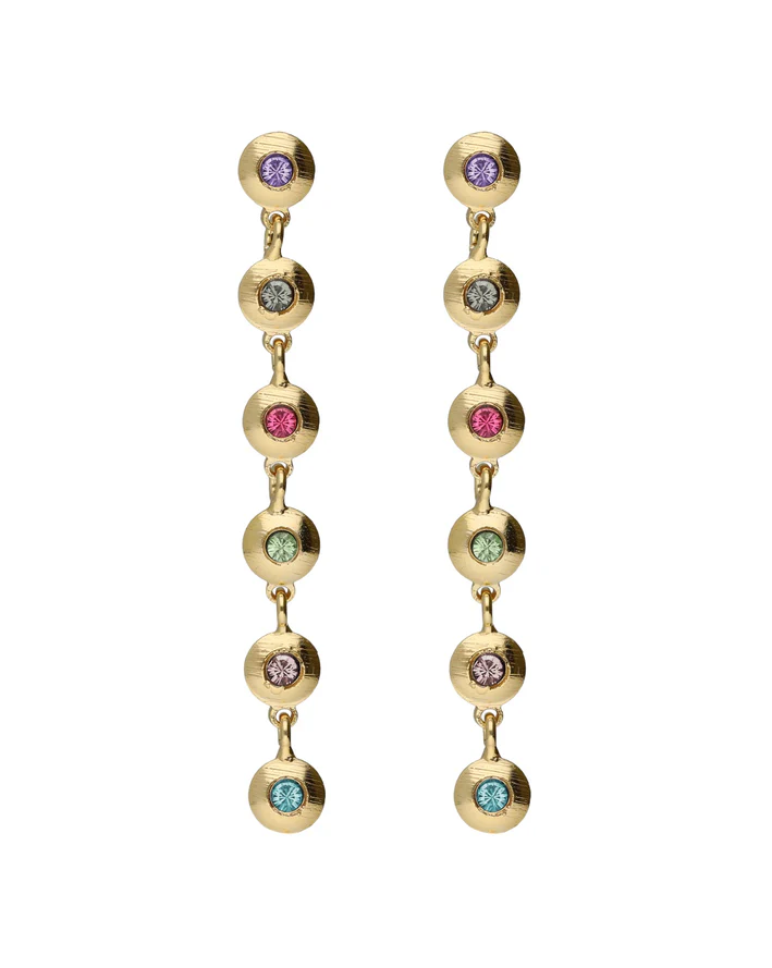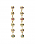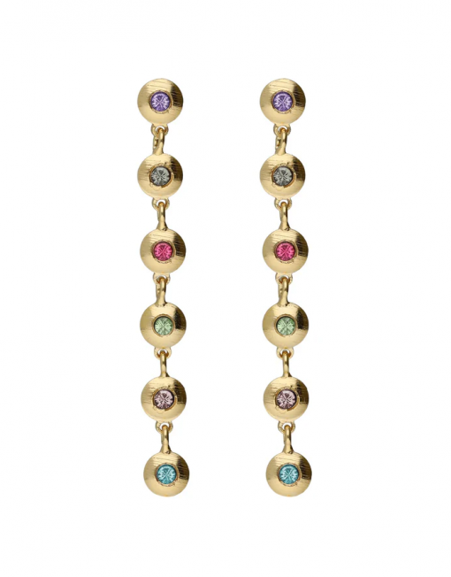 Pendientes largos con cristal multicolor de Plata de Ley bañada en Oro de 18kt. Tamaño del motivo de 4,5cm x 0,5cm en forma de círculo. Tamaño del cristal 0,2cm con cierre tuerca a presión de la colección Bruma