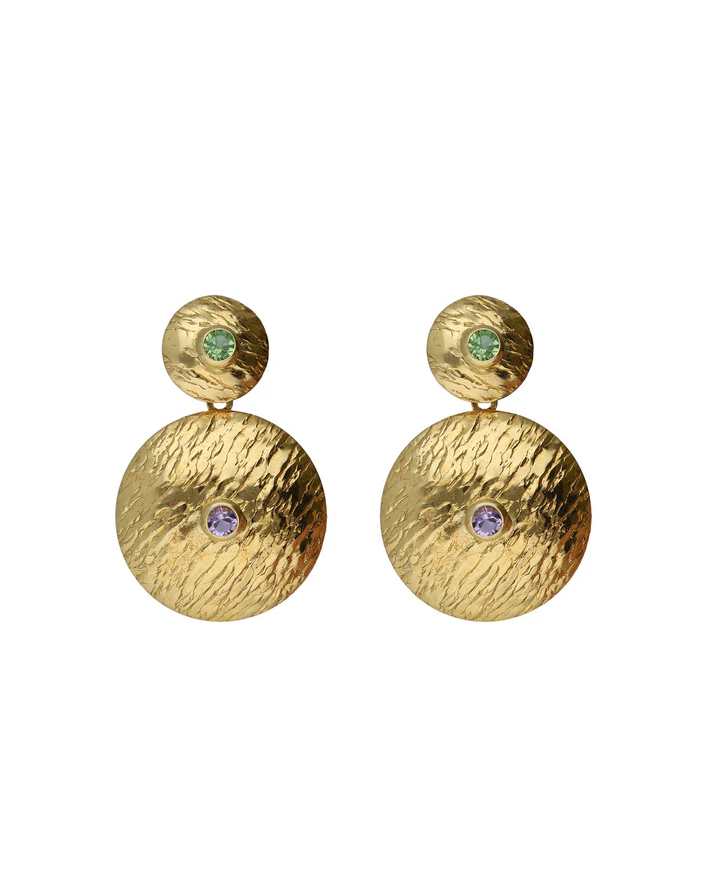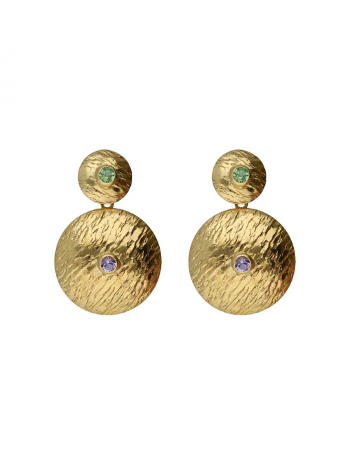 Pendientes largos con cristal violeta de Plata de Ley bañada en Oro de 18kt. Tamaño del motivo de 3cm x 2cm en forma de círculo. Tamaño del cristal 0,2cm con cierre tuerca a presión de la colección Bruma