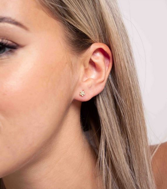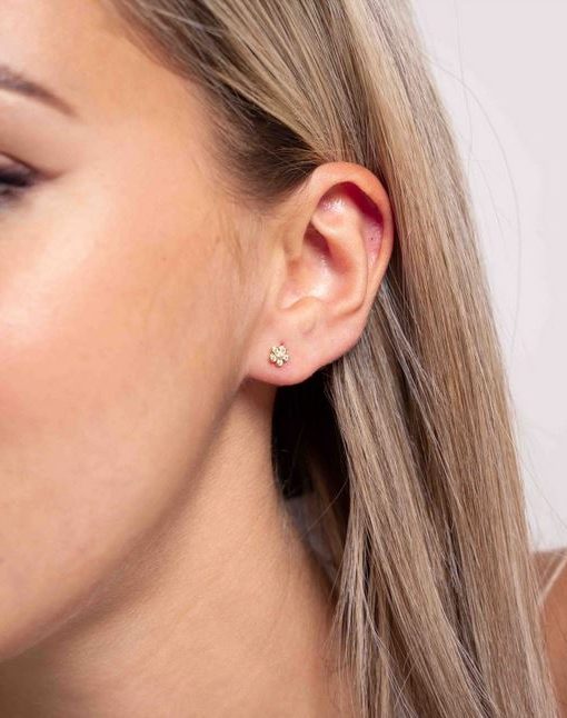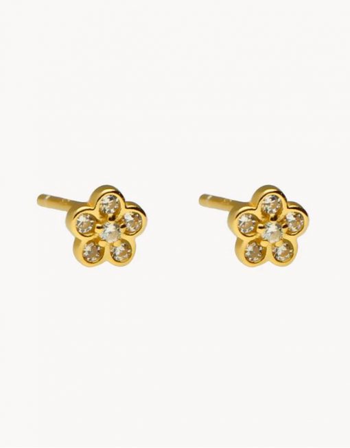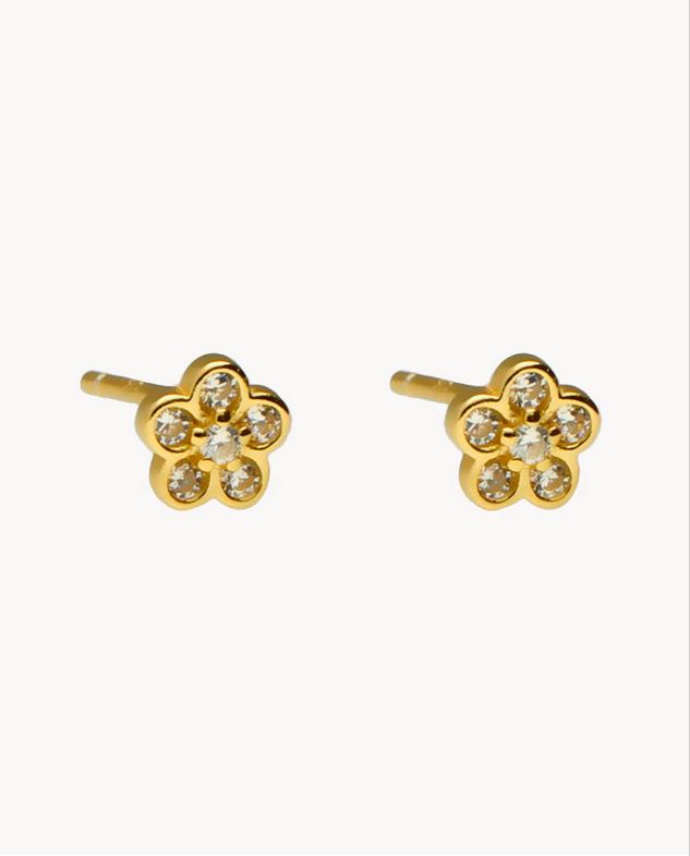 Pendientes de plata de ley 925 bañada en oro 18K con flor de 5 mm de diámetro y circonitas blancas en su interior, cierre de presión.