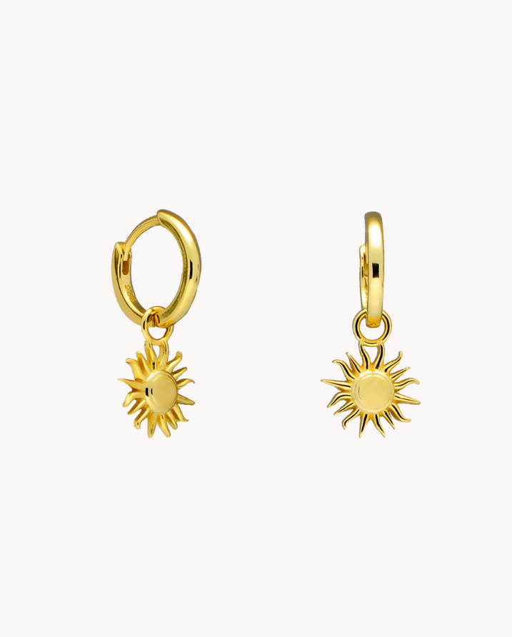Pendientes de aro de plata de ley 925 bañados en oro 18K de 9 mm de diámetro interior con colgante en forma de sol de 10 mm x 10 mm (ancho por alto) con movimiento libre y cierre africano.