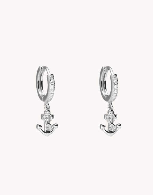 Pendientes de aro de 10 mm de diámetro (interior) con colgante en forma de ancla de 7 mm x 10 mm (ancho por alto) con movimiento y circonitas blancas, plata de ley 925 bañados en rodio y cierre africano.
