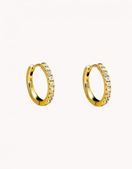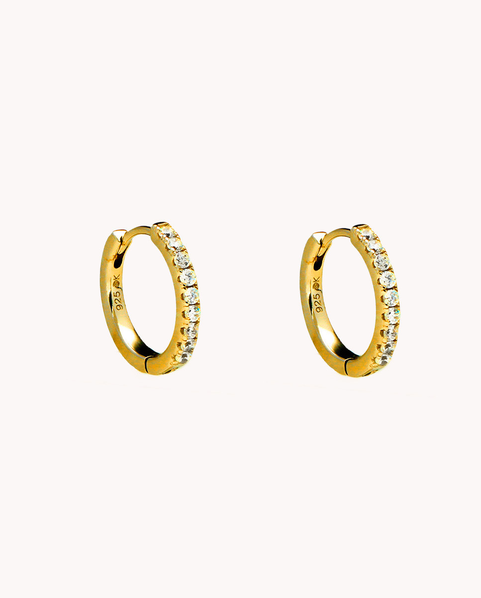 Pendientes de aro de plata de ley 925 bañada en oro 18K de 11 mm de diámetro interior y 2 mm de grosor con circonitas blancas y cierre africano.