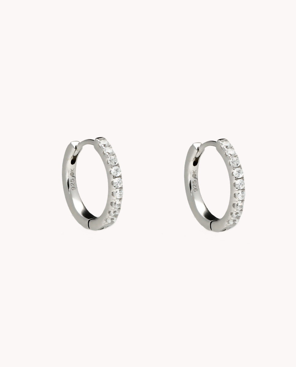 Pendientes de aro de plata de ley 925 bañada en rodio de 11 mm de diámetro interior y 2 mm de grosor con circonitas blancas y cierre africano.