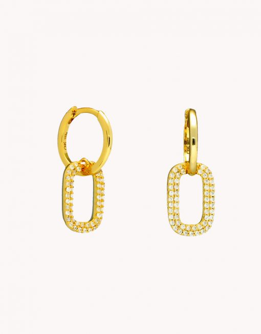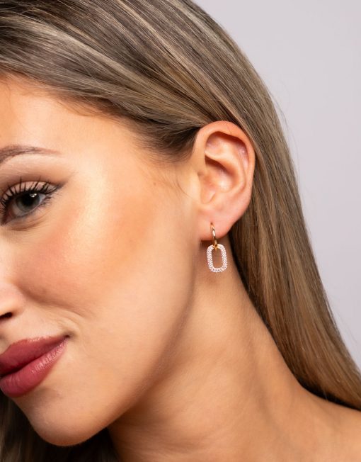 Pendientes de aro de plata de ley 925 bañada en oro 18K de 11 mm de diámetro interior y 2 mm de grosor con colgante rectangular de 13 x 9 mm (ancho por alto) con circonitas blancas en micro pavés y cierre africano.