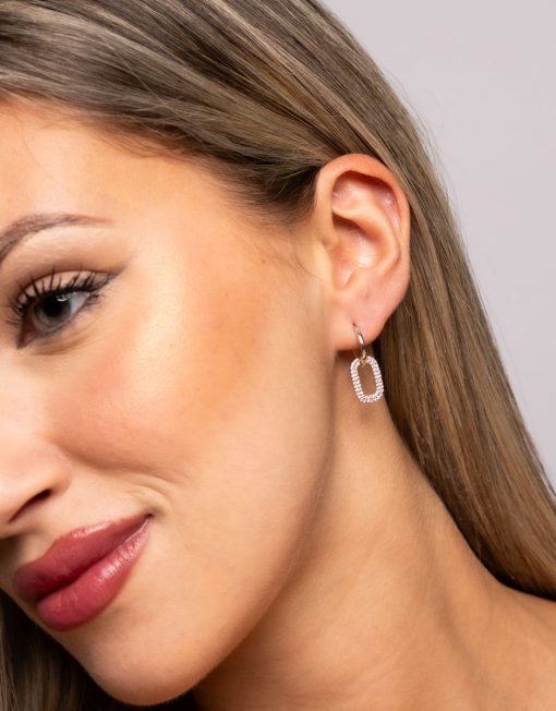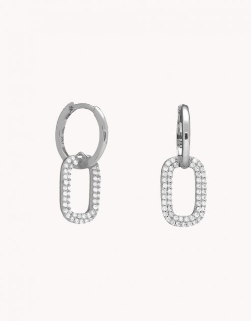Pendientes de aro de plata de ley 925 bañada en rodio de 11 mm de diámetro interior y 2 mm de grosor con colgante rectangular de 13 x 9 mm (ancho por alto) con circonitas blancas en micro pavés y cierre africano.