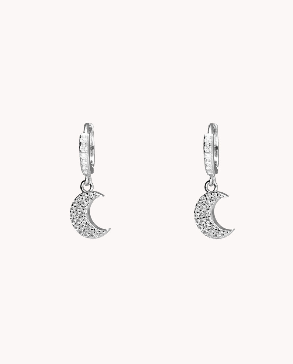 Pendientes de aro de 8 mm de diámetro (interior) con colgante en forma de luna de 7 mm x 10 mm (ancho por alto) con movimiento y circonitas blancas, plata de ley 925 bañados en rodio y cierre africano.