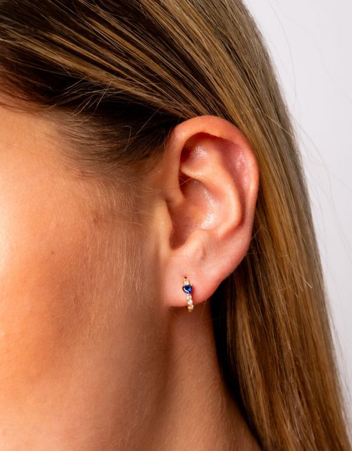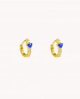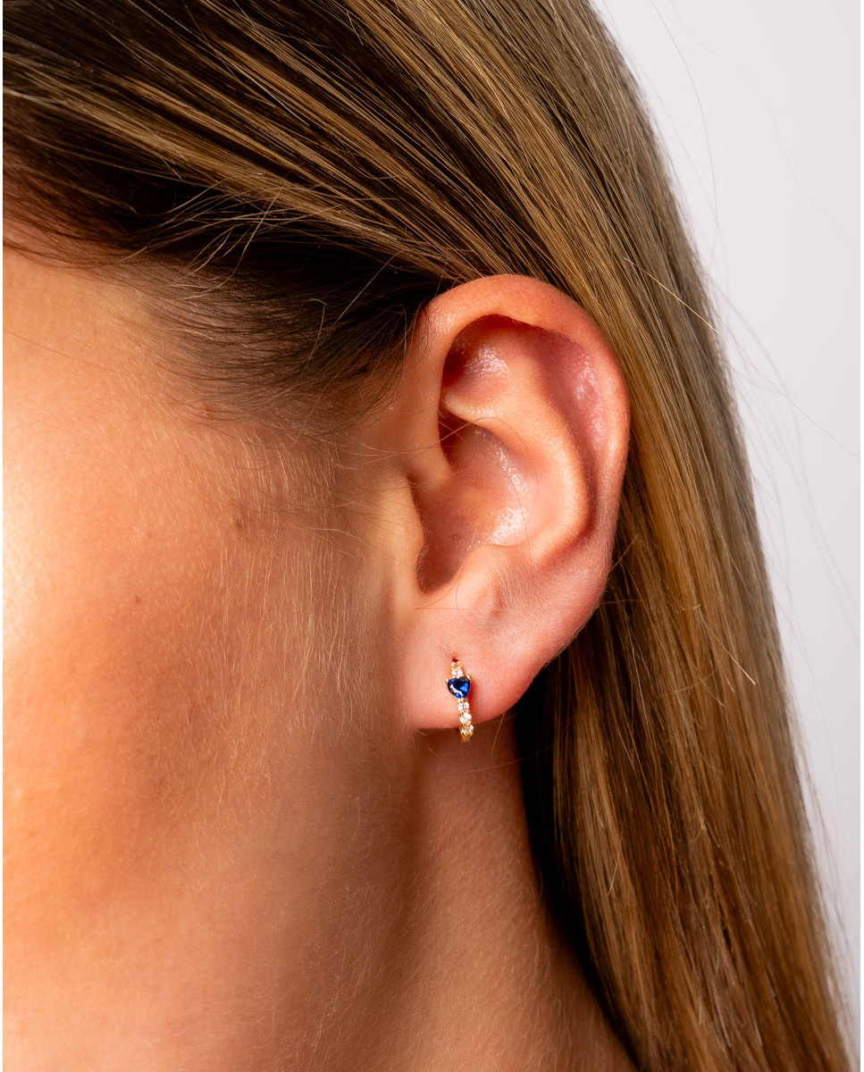 Pendientes de aro de plata de ley 925 bañada en oro 18K de 8 mm de diámetro interior y 2 mm de grosor con circonitas blancas en su borde, corazón zafiro central de 3 mm y cierre africano.