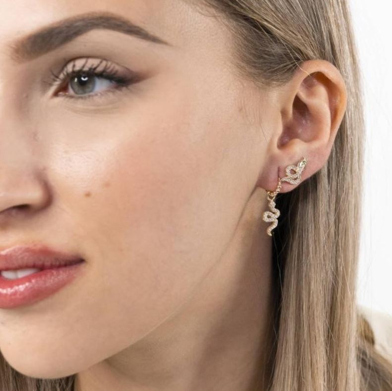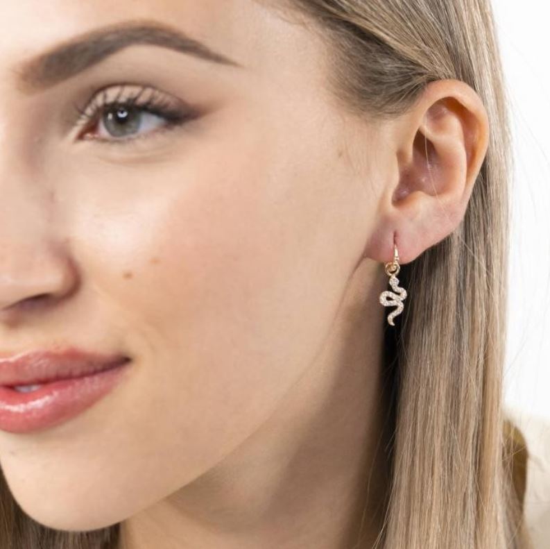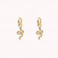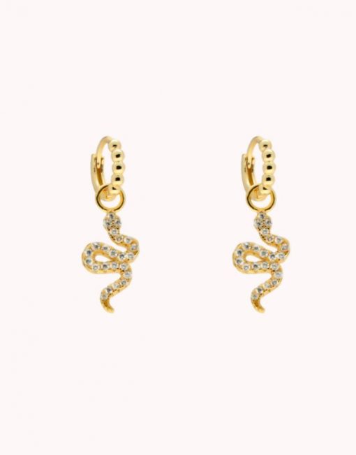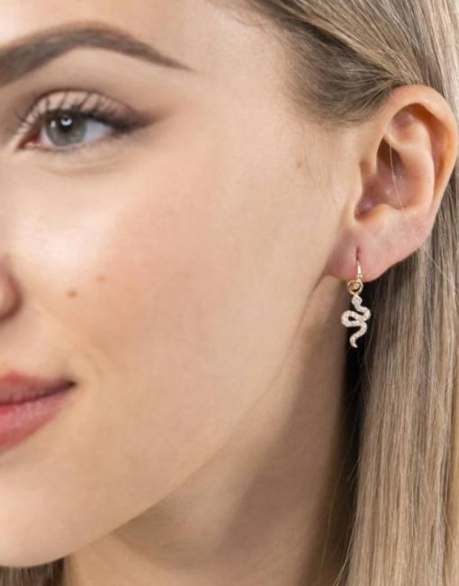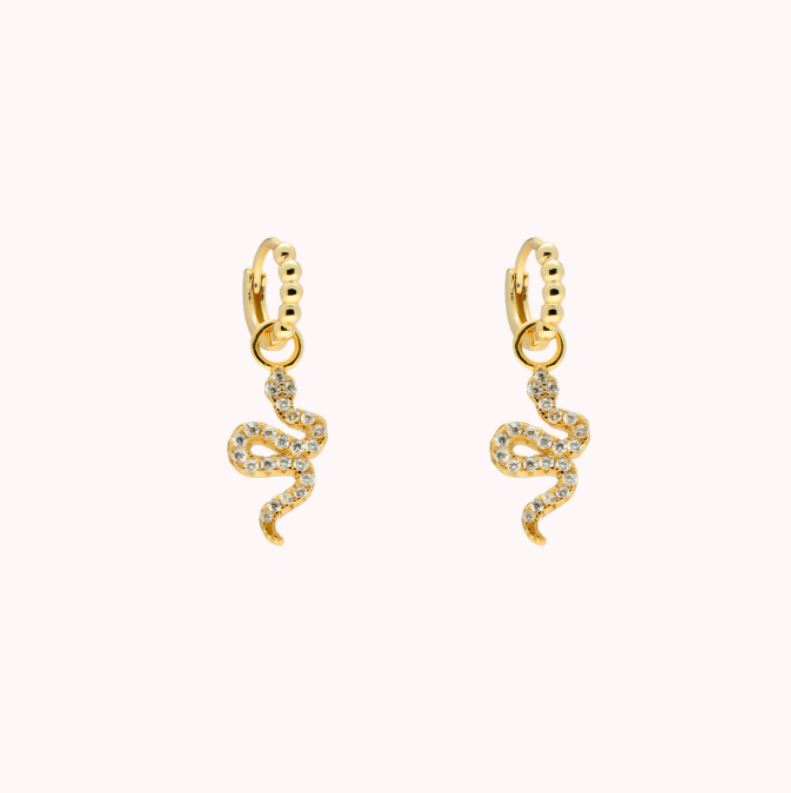 Pendientes de aro de plata de ley 925 bañada en oro de 7 mm de diámetro (interior) y 1,5 mm de grosor, detalle de bolitas y colgante de serpiente de 8 mm x 15 mm (ancho por alto) con circonitas blancas, cierre africano.