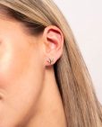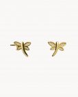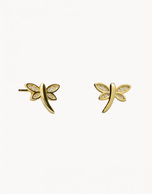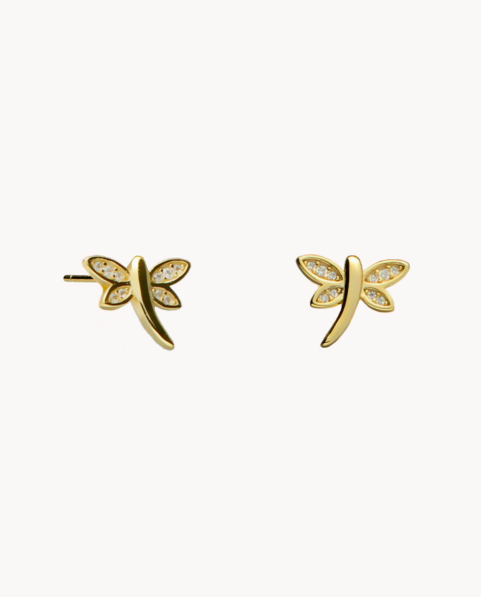 Pendientes de plata de ley 925 bañada en oro 18K con forma de libélula de 10 mm x 8 mm (ancho por alto) y circonitas blancas, cierre de presión.