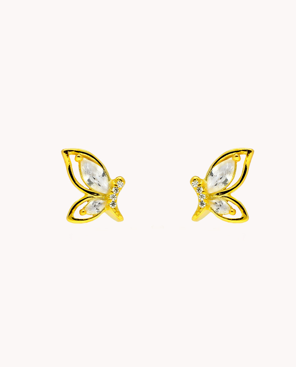 Pendientes de plata de ley 925 bañada en oro 18K en forma de mariposa con alas de circonitas blancas de 7 mm con cierre de presión.