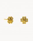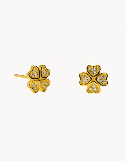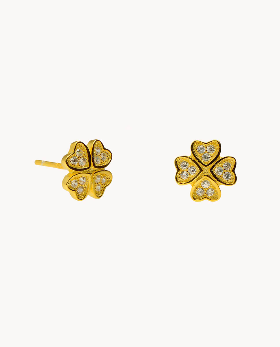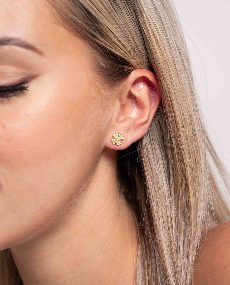 Pendientes de plata de ley 925 bañada en oro 18K con forma de trébol de 9 mm x 9mm (ancho por alto) y circonitas blancas, cierre de presión.