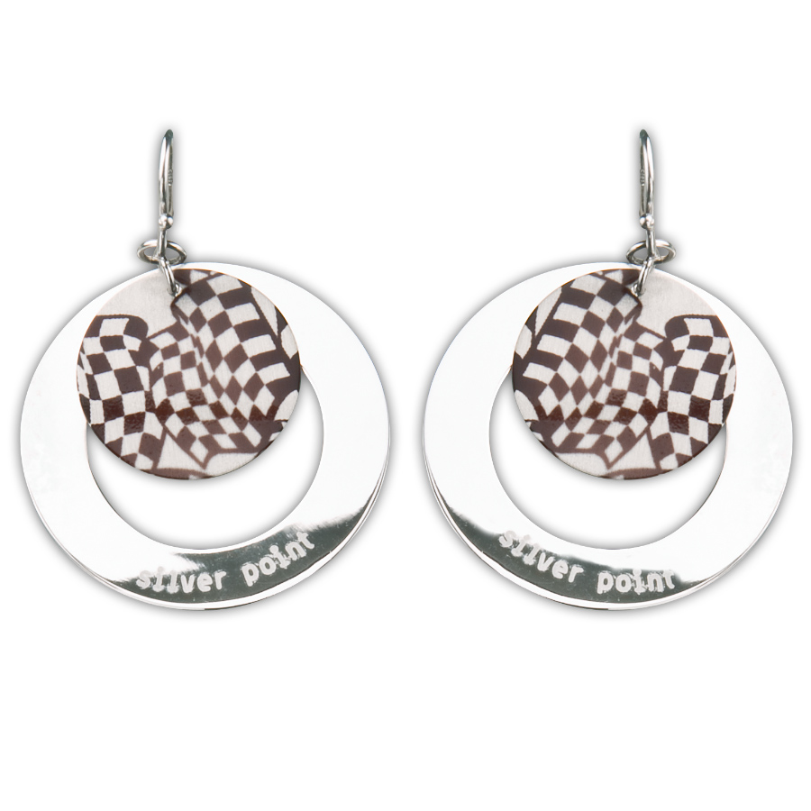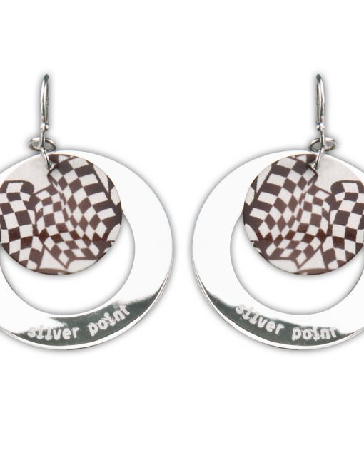 Inspirada en los años 60 y en el Op-art, los juegos geométricos en blanco y negro crean la línea más vanguardista y rompedora. Las joyas están realizadas en plata 925 y estampadas en optical print.