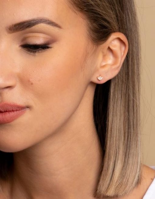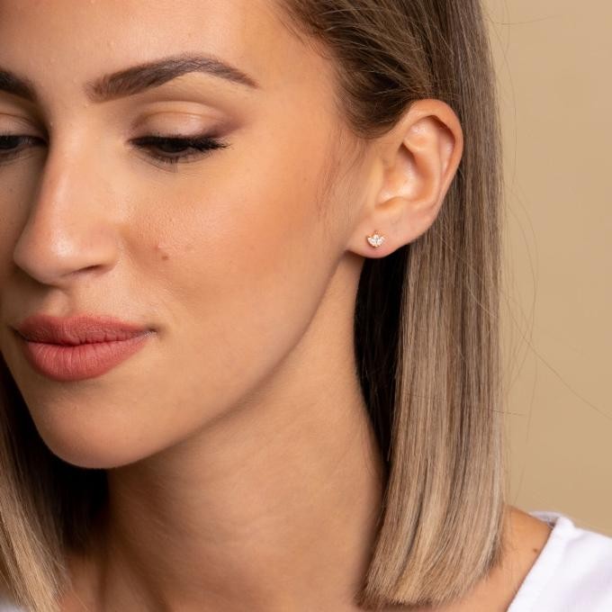 Pendientes de plata de ley 925 bañada en oro con corona y circonitas blancas, largo de palo 1 cm y cierre de rosca.