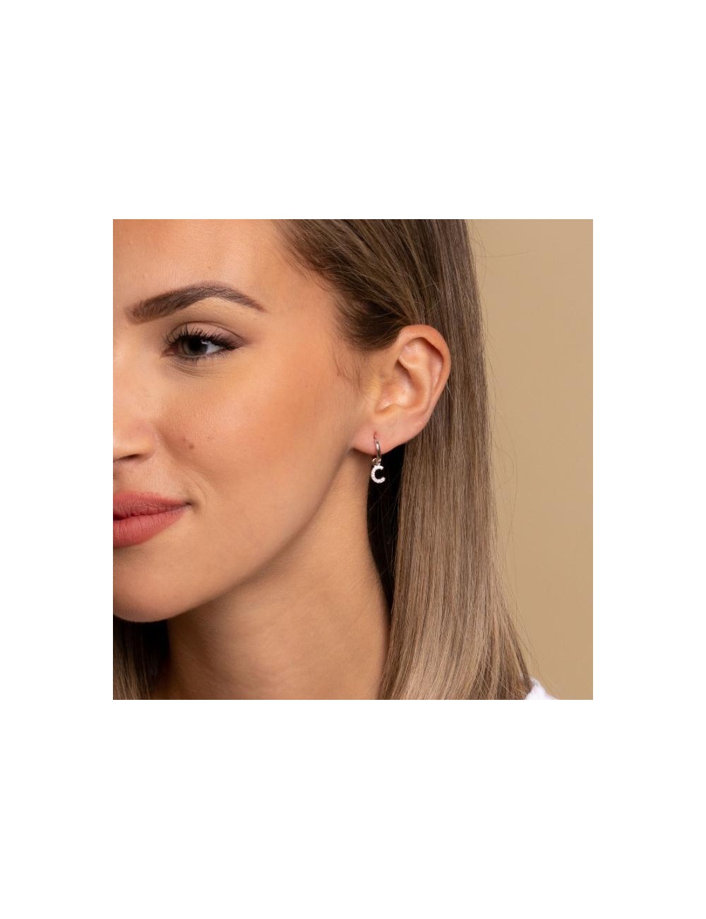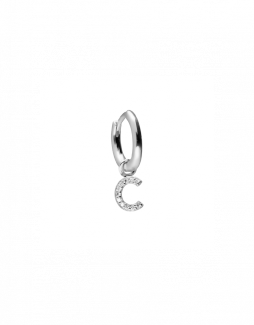 Pendiente de aro de plata de ley 925 bañada en rodio de 8 mm de diámetro interior y 2 mm de grosor con colgante de letra C con circonitas blancas de 7 mm de largo, cierre africano.