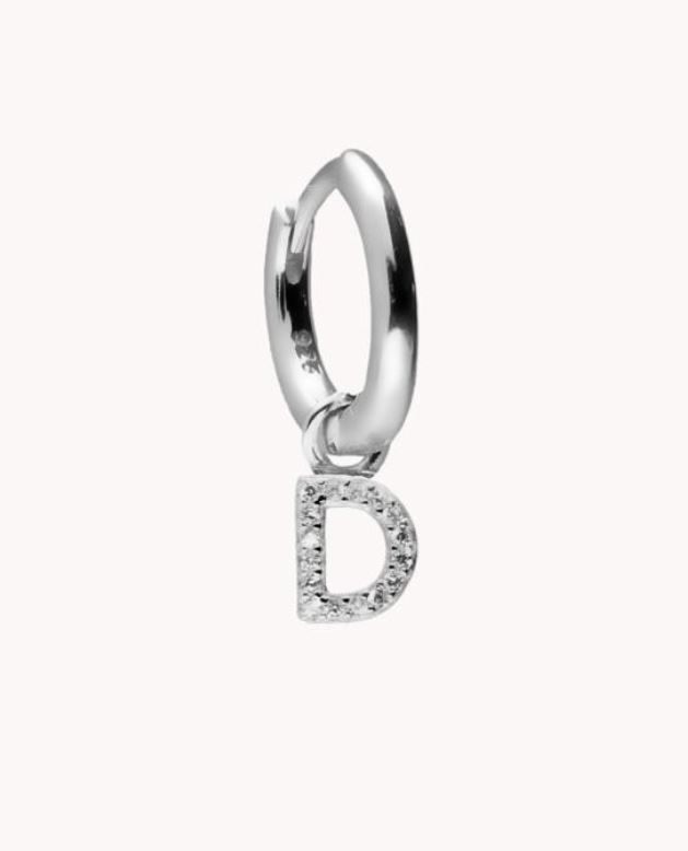 Pendiente de aro de plata de ley 925 bañada en rodio de 8 mm de diámetro interior y 2 mm de grosor con colgante de letra D con circonitas blancas de 7 mm de largo, cierre africano.