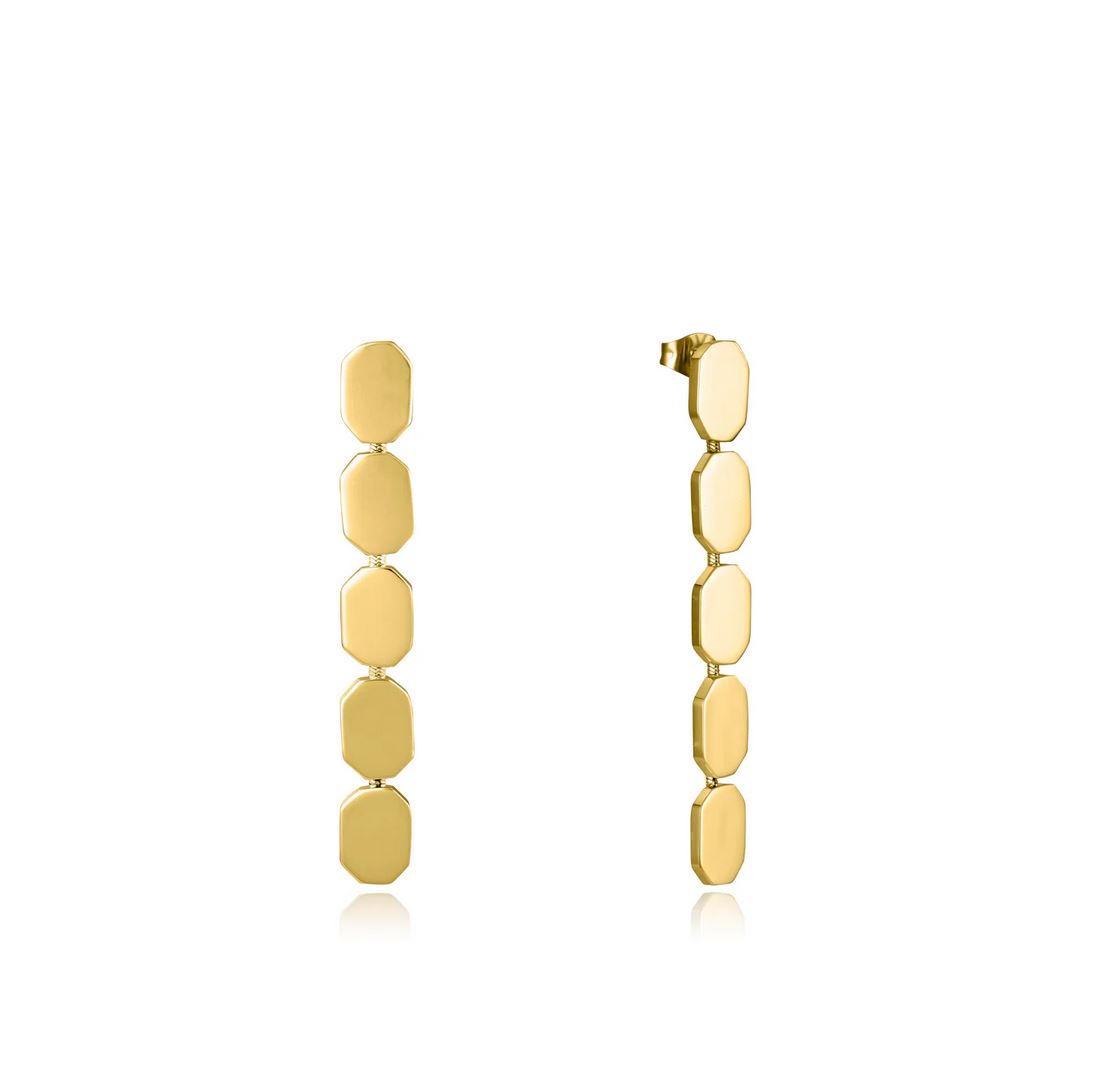 Pendientes de mujer en acero con acabado IP dorado, diseñados con una elegante fila de placas. Este diseño moderno y minimalista añade un toque de sofisticación y distinción a cualquier conjunto, siendo perfectos tanto para el día a día como para ocasiones especiales. El acabado dorado aporta un brillo sutil, mientras que la estructura en fila de placas crea un efecto visual único. Estos pendientes son ideales para la mujer que busca un accesorio elegante y contemporáneo. Largo 5,2 cm.