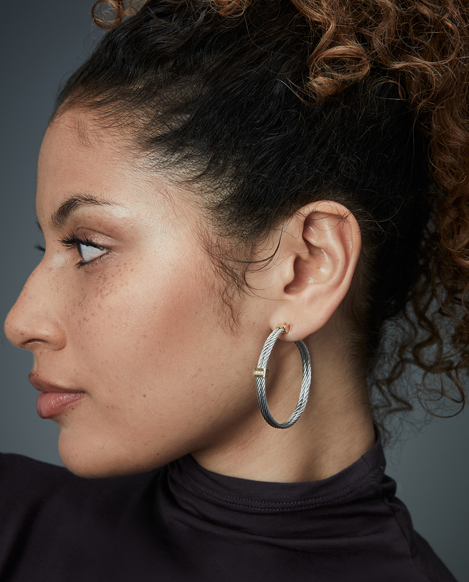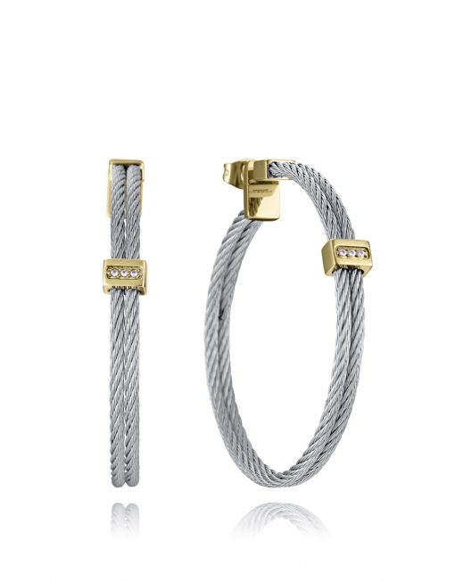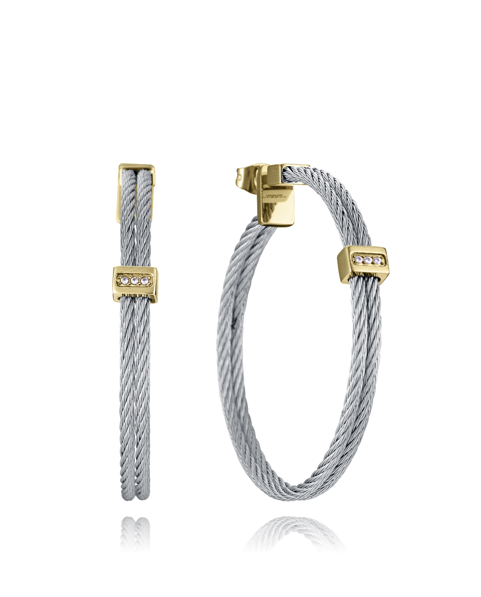 Unos pendientes que combinan elegancia y sofisticación en un diseño único. Fabricados en acero con acabado IP dorado, presentan un doble cable unido por una barra central, creando un efecto fluido y moderno. Las circonitas blancas engastadas aportan un toque de brillo sutil, realzando la pieza con un destello atemporal. Con un diámetro de 4,5 cm, estos pendientes tienen la medida perfecta para destacar con distinción sin perder la ligereza. Ideales para mujeres que buscan un accesorio versátil y elegante, que combine un diseño contemporáneo con un toque de luminosidad.