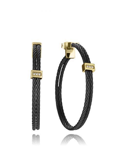 Unos pendientes que fusionan elegancia y modernidad en un diseño audaz. Fabricados en acero con acabados IP negro y dorado, presentan un doble cable unido por una barra central, creando un efecto dinámico y sofisticado. Las circonitas engastadas añaden un toque de brillo luminoso que resalta la pieza con elegancia. Con un diámetro de 4,5 cm, estos pendientes tienen la medida perfecta para destacar con distinción sin perder la ligereza. Ideales para mujeres que buscan un accesorio contemporáneo que combine estilo, versatilidad y un toque de luminosidad. Diámetro 4,5 cm.