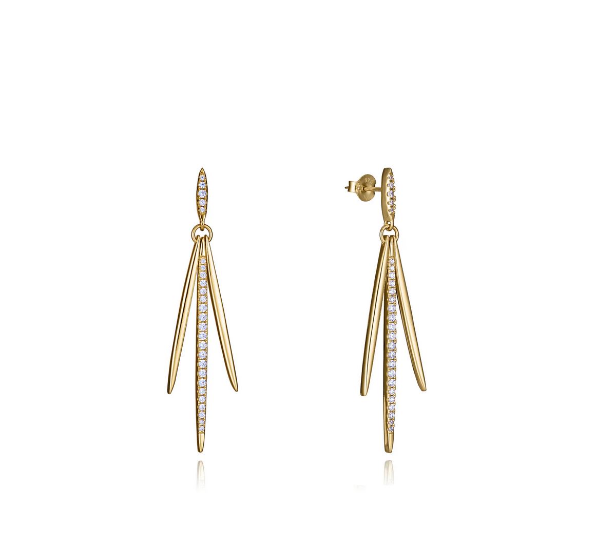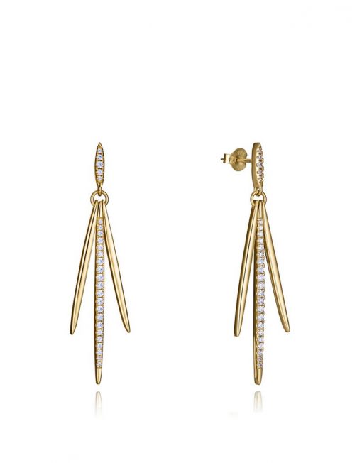 Llamativos pendientes de plata de primera ley con baño de oro combinan elegancia y modernidad en un diseño único. Con tres colgantes adornados con brillantes circonitas blancas, aportan un toque de lujo y sofisticación. Su largo de 52 cm los convierte en una pieza audaz y destacada, ideal para ocasiones especiales donde se busca un accesorio que haga una declaración de estilo. Perfectos para la mujer que busca un complemento elegante y llamativo, estos pendientes son la opción ideal para realzar cualquier look con un toque de distinción. Largo 52 cm.