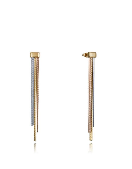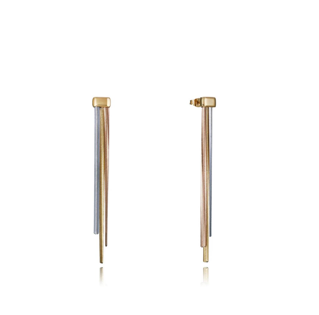 Pendientes tricolor de acero con diseño de cadena serpiente, combinando tres tonos: acero, IP dorado e IP rosa. Estos pendientes destacan por su estilo moderno y sofisticado, aportando un toque de elegancia a cualquier look. La combinación de los tres tonos metálicos crea un efecto visual único y versátil, ideal para complementar tanto atuendos casuales como formales. Perfectos para la mujer que busca una joya con carácter y distinción, estos pendientes tricolor son una pieza imprescindible en cualquier colección. Largo 7,5 cm.