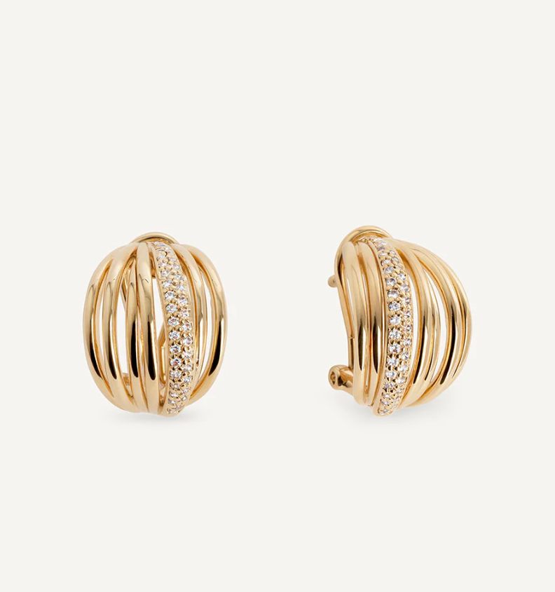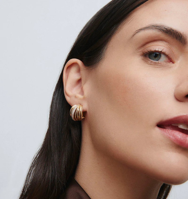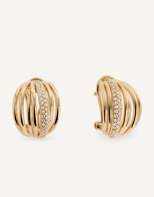 Pendientes semiluna Allure tiras bañados con una gruesa capa de oro macizo de 18 kt, lo que garantiza una mayor durabilidad. Engastados con circonitas blancas, cuya. similitud con el diamante es casi indistinguible. Tienen una longitud de 18 mm y un cierre a omega.