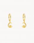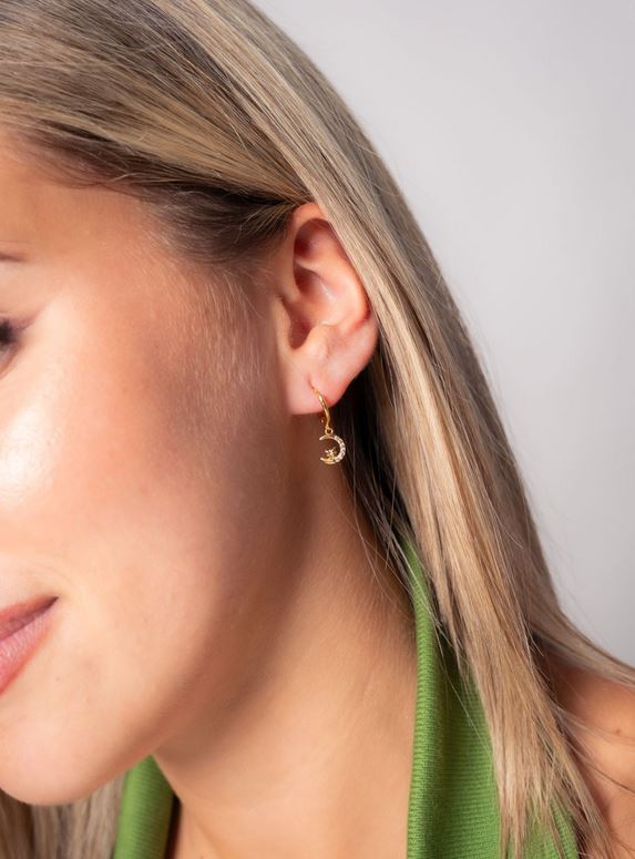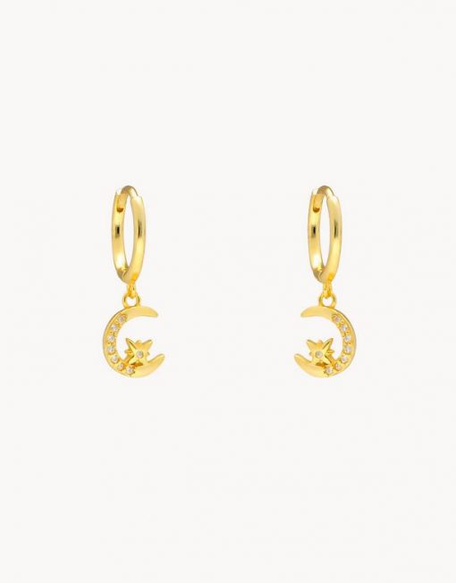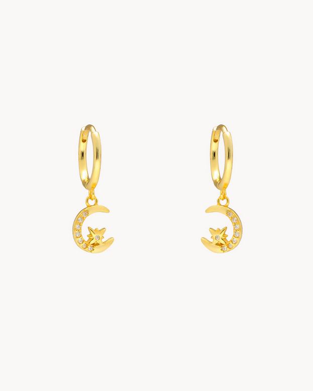 Pendientes de aro de plata de ley 925 bañada en oro de 9 mm de diámetro interior y 1,5 mm de ancho, colgante de luna y estrella polar con circonitas blancas y cierre africano.