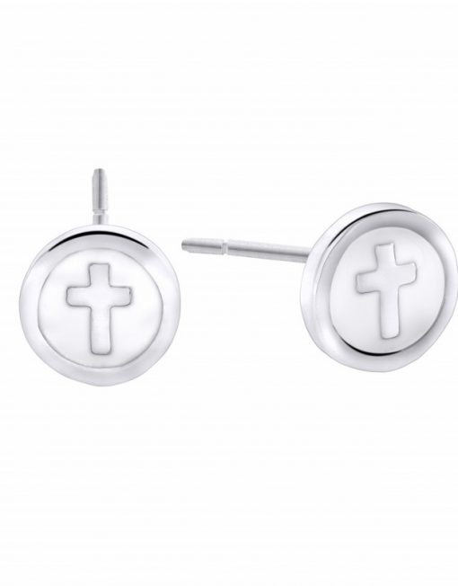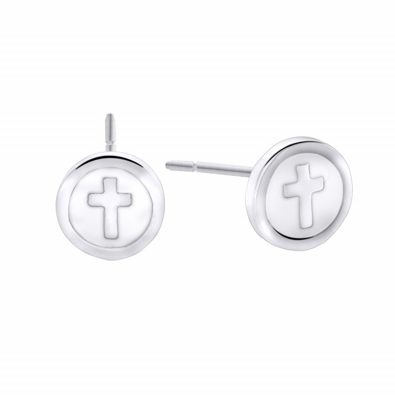 Pendientes Mi Primera Joya, circulo con cruz, esmalte white.