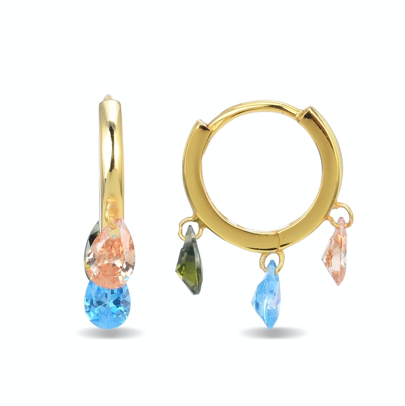 PENDIENTES SAON Piedras: CIRCONITA MULTICOLOR Acabado BAÑO DE ORO AMARILLO DE 18 QUILATES Medidas: alto: 4.000 mm, largo: 19.300 mmy ancho: 0.000 mm Peso: 2.47 gr. Cierre: ARO HUGGIE Tallado: ENFILADO Tarjeta de colección: AMOR