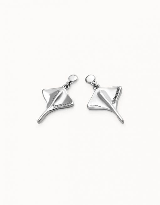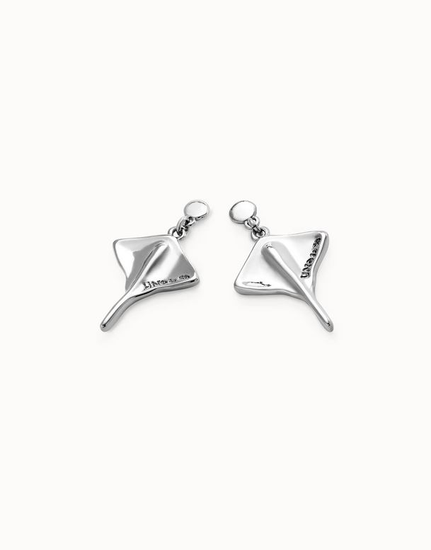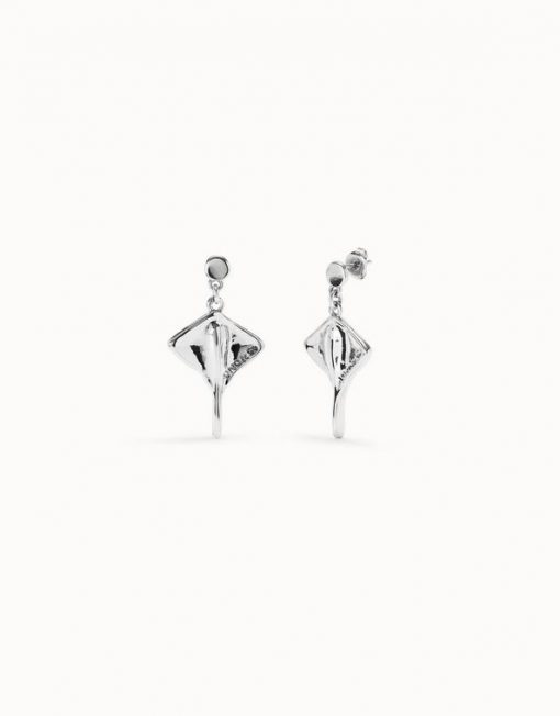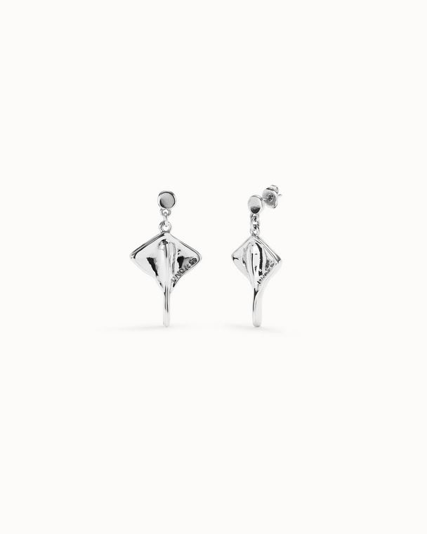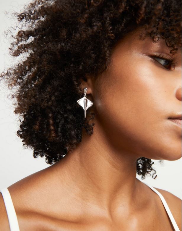 Estos pendientes bañados en plata reinterpretan la silueta de la mantarraya con una estética escultural y fluida.