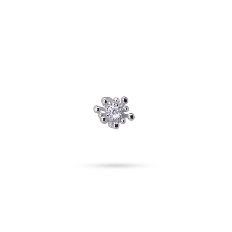 Pendiente tipo piercing con diseño flor. Realizado en plata de ley 925 y circonitas, está disponible en color oro y plata. Cargado de vitalidad es perfecto para llevar junto con otros mini aros. Figura de 5 mm. Cierre de rosca. Se vende por unidad.