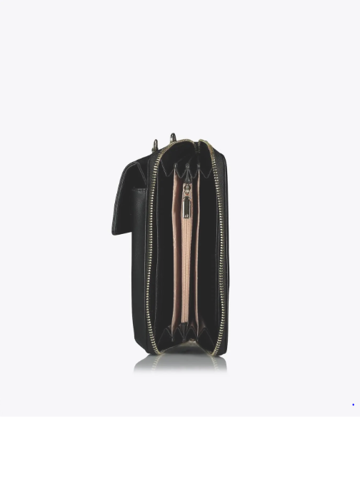 Funda cruzada para teléfono móvil con tapa y correa de cadena ajustable. Tiene una billetera incorporada con bolsillos para billetes, monedas y tarjetas. Fabricado con material reciclado.
