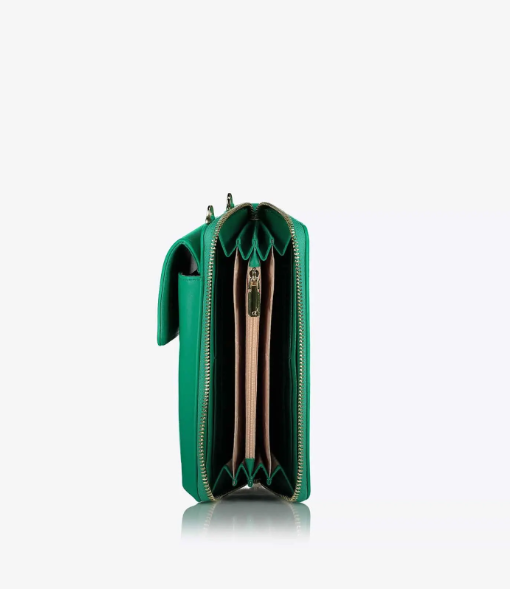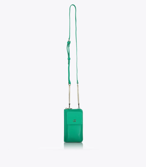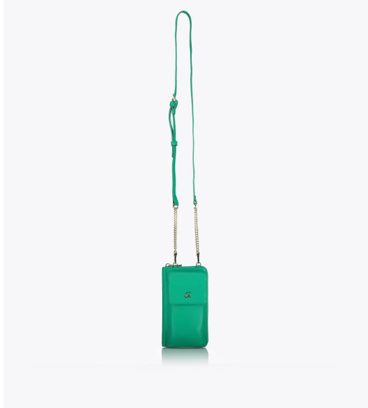 Funda cruzada para teléfono móvil con tapa y correa de cadena ajustable. Tiene una billetera incorporada con bolsillos para billetes, monedas y tarjetas. Fabricado con material reciclado.