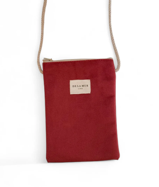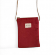 Bolsito porta móvil para llevar tipo bandolera. Con cremallera en la parte superior y cordón largo de algodón de color beige. Con tejido grueso de terciopelo granate. Cada articulo puede tener una variación en el estampado, dependiendo de donde se haya efectuado el corte de la pieza. Forrado de tejido grueso de color gris en la parte interior. Para su correcto mantenimiento se aconseja lavarlo en frío a mano y no utilizar secadora.
