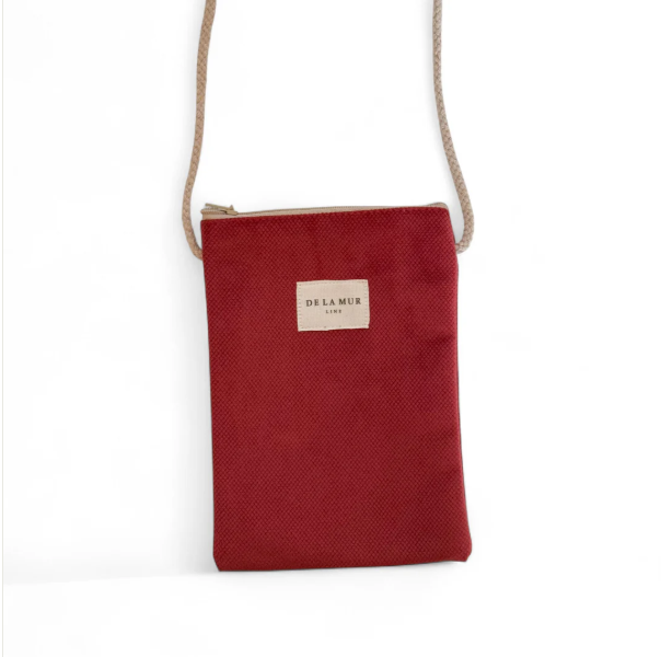 Bolsito porta móvil para llevar tipo bandolera. Con cremallera en la parte superior y cordón largo de algodón de color beige. Con tejido grueso de terciopelo granate. Cada articulo puede tener una variación en el estampado, dependiendo de donde se haya efectuado el corte de la pieza. Forrado de tejido grueso de color gris en la parte interior. Para su correcto mantenimiento se aconseja lavarlo en frío a mano y no utilizar secadora.