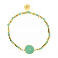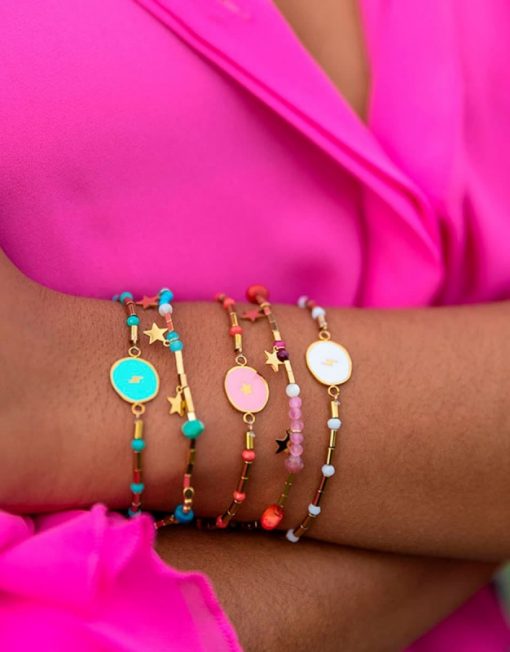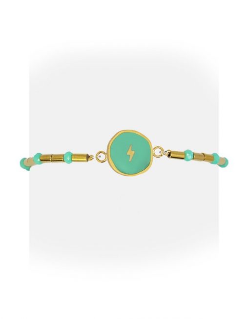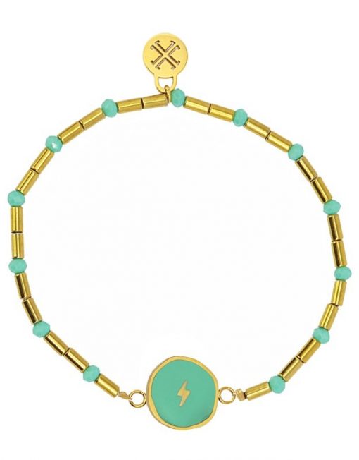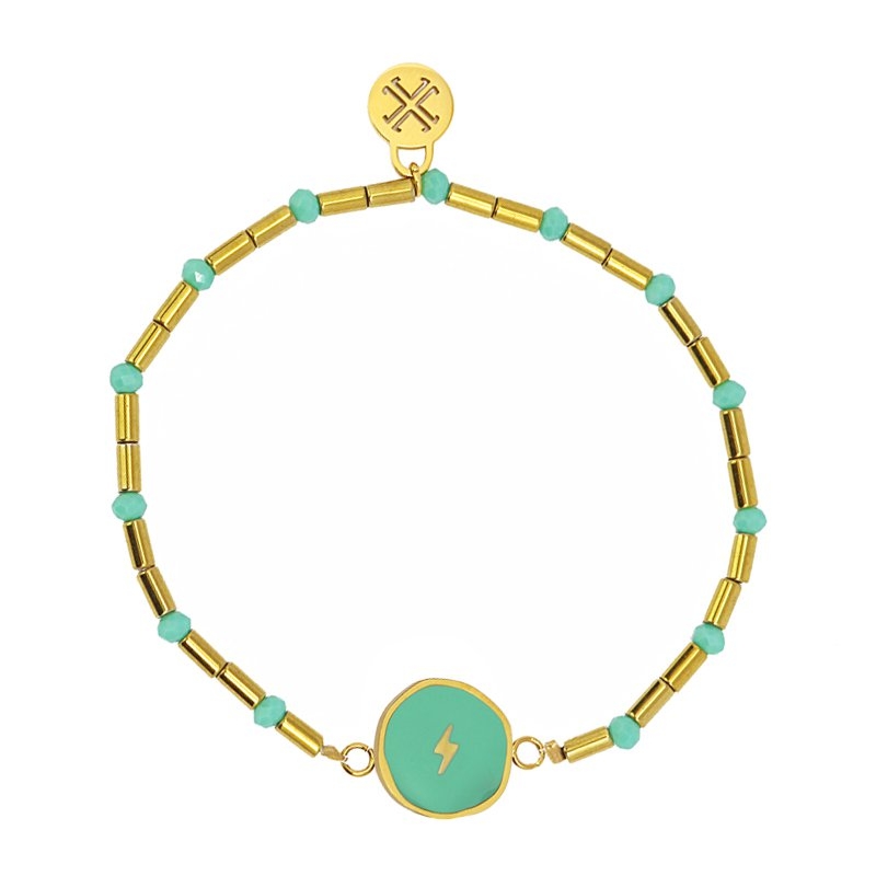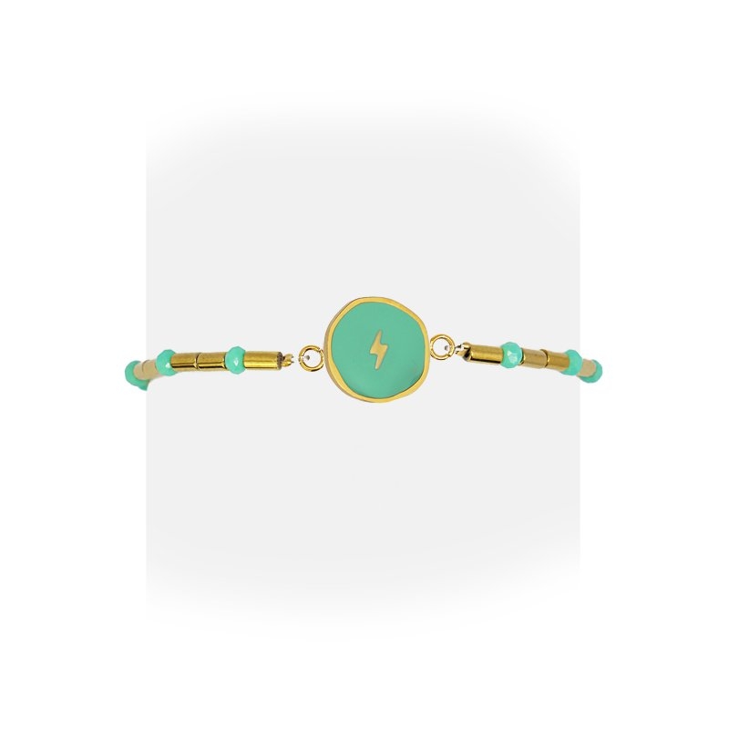 Pulsera elástica con cuentas de acero, cristal y detalle esmaltado con rayo. Detalles del producto