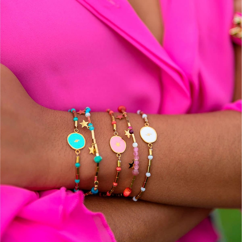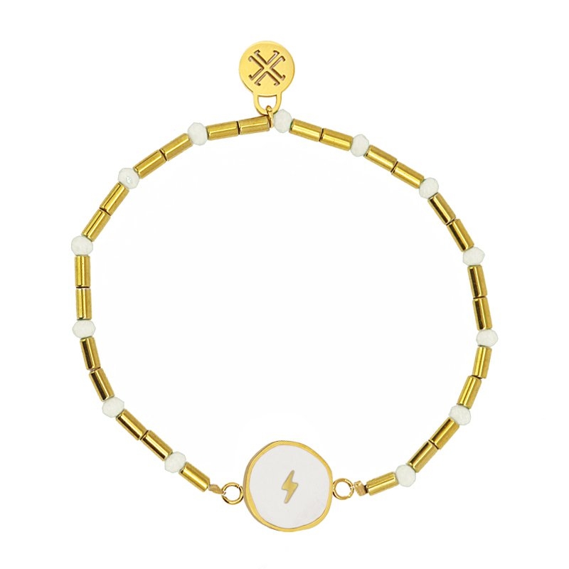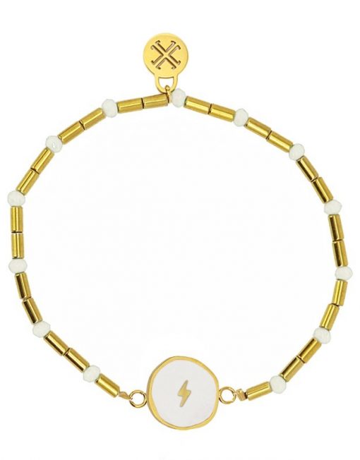 Pulsera elástica con cuentas de acero, cristal y detalle esmaltado con rayo. Detalles del producto