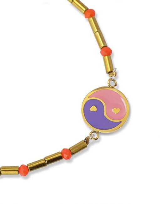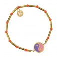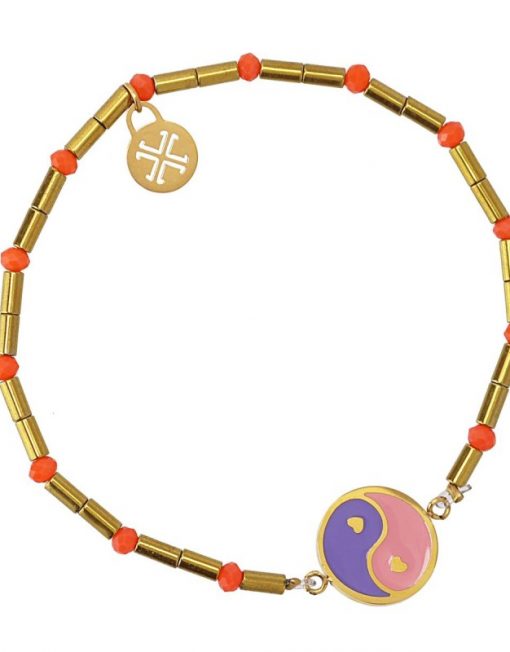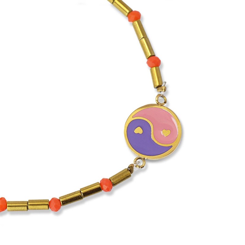 Pulsera elástica de acero quirúrgico hipoalergénico combinado con cuentas de cristal y detalle central con figura esmaltada inspirada en el Yin y el Yang. Súper ligera y versátil, es perfecta para llevar en tu día a día combinada con looks relajados. Su combinación de colores la hace especialmente femenina y favorecedora. ¿Te la compras?