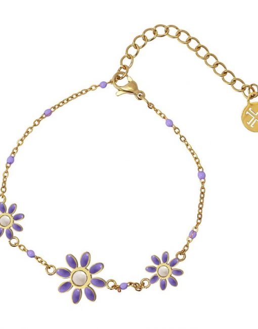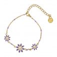 Pulsera de cadena fina con abalorios en forma de margaritas esmaltadas en colores pastel (de 12 y 8 mm). Disponible en rosa o morado, es una pulsera ligera y cómoda de inspiración campestre que puedes llevar a diario combinada con su collar o pendientes a juego. Es de acero quirúrgico hipoalergénico dorado y mide 15 cm de largo. Cuenta con extensión extra de 5 cm y cierre tipo langosta.