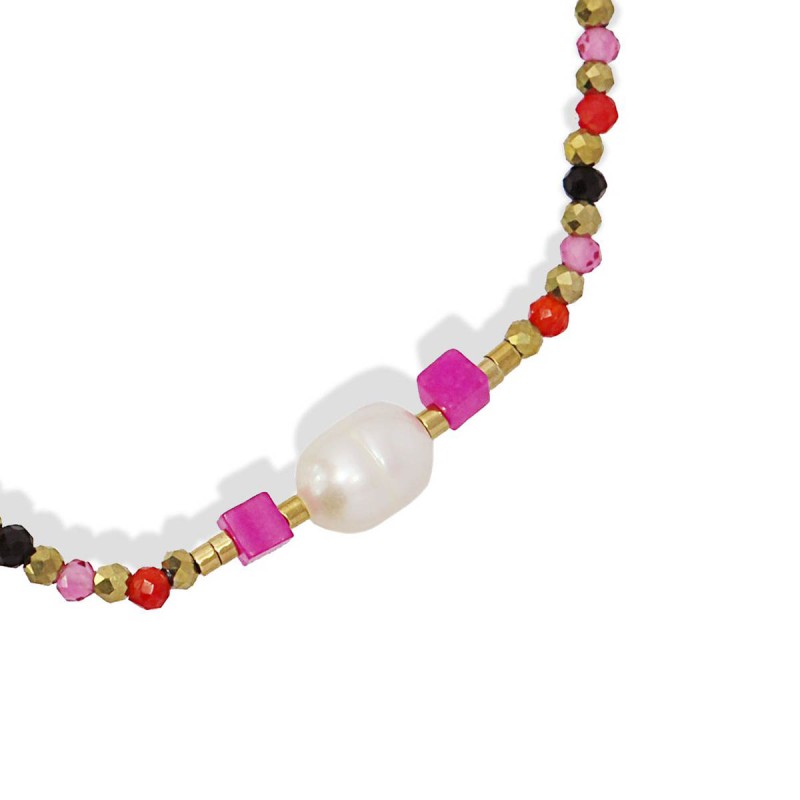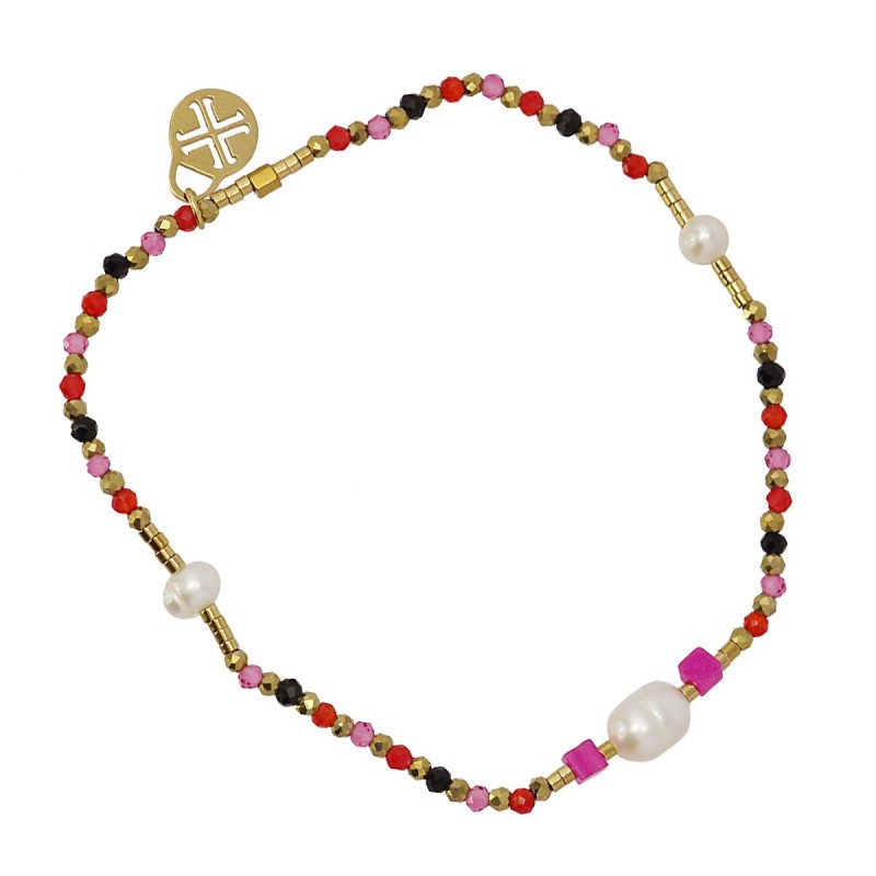 Pulsera elástica de cuentas de cristal, hematita, piedra natural, perlas de agua dulce y acero quirúrgico. Sencilla, cómoda pero muy colorida, es ideal para llevar sola o combinada con otras pulseras étnicas. Disponible en dos tonalidades de color muy sugerentes. Incluye medallita con logotipo anartxy.