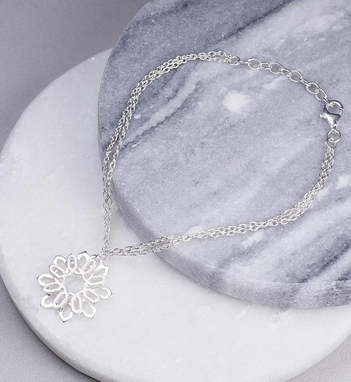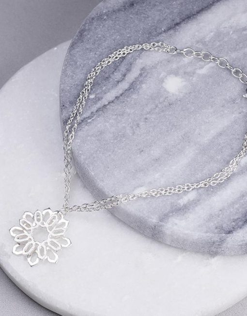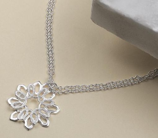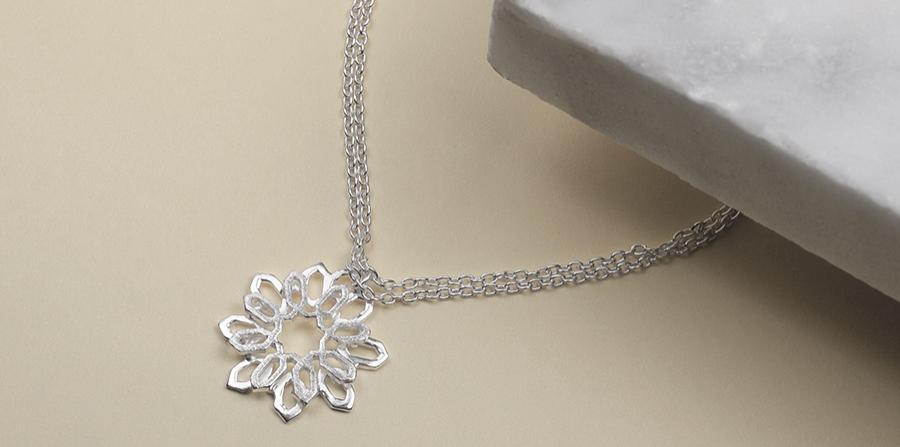 Pieza de fundición de plata de 925" y filigrana realizada manualmente con hilo y marco de plata sobre cinta de cuero con cierre mosquetón y cadena de plata.