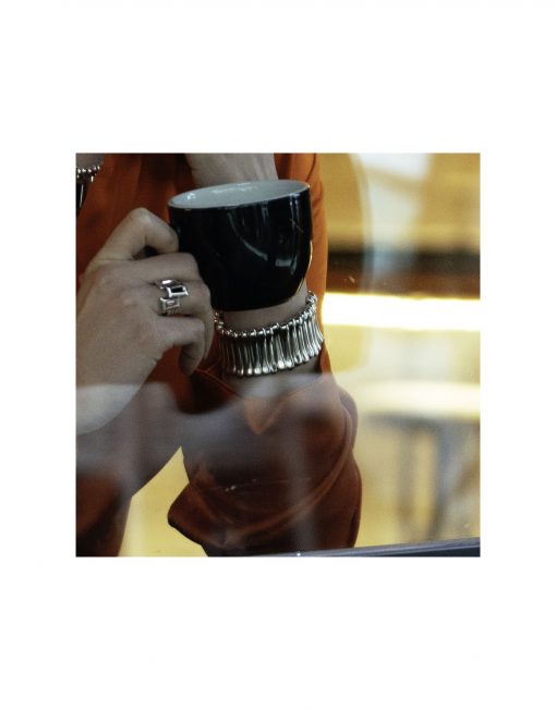 Pulsera Odele bañada en plata de la Colección 25th de Ciclón jewelry. Pulsera elástica tipo brazalete de 34 mm con diseño de pasantes.