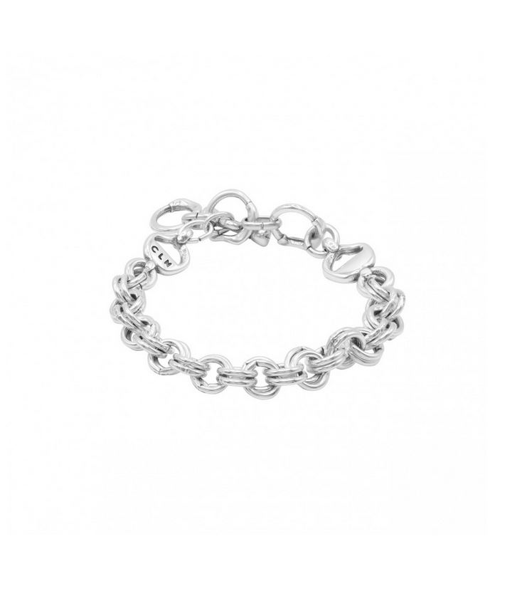 Una pulsera de doble cadena bañada en plata que envuelve la muñeca con un brillo limpio y sereno. El motivo circular aporta equilibrio visual y una sensación de continuidad. Su cierre en T, cómodo y visible, suma carácter al diseño. Combina acabados cuidados y una presencia ligera. Ajustable de 17 a 20 cm, acompaña gestos cotidianos con elegancia natural. Ideal para regalar o para llevar como sello personal.