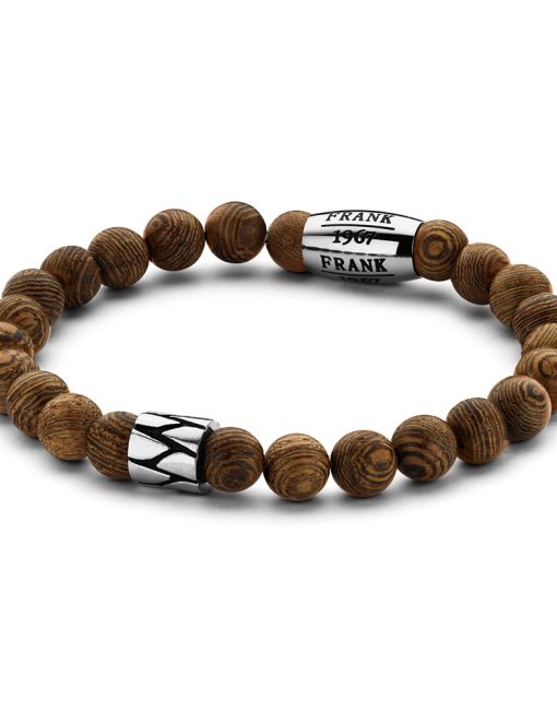 La pulsera elástica tiene cuentas de madera de 8 mm y dos de acero, incluida una con el logotipo de Frank 1967. La pulsera viene en talla única (20 cm). La pulsera elástica se adapta a casi todas las muñecas.