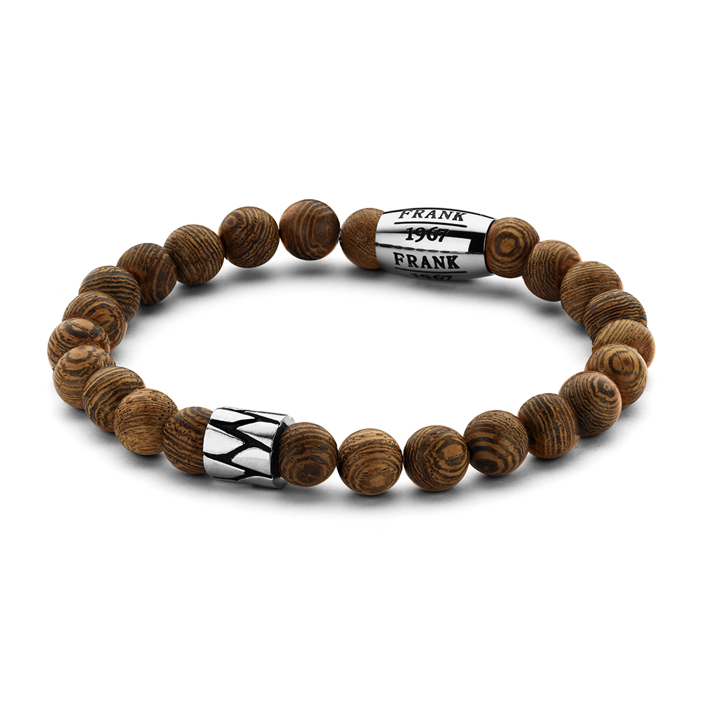 La pulsera elástica tiene cuentas de madera de 8 mm y dos de acero, incluida una con el logotipo de Frank 1967. La pulsera viene en talla única (20 cm). La pulsera elástica se adapta a casi todas las muñecas.