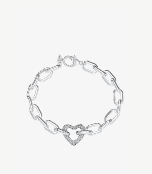 Brazalete de acero para mujer de la marca Guess. Cadena plateada de gran tamaño con motivo central de corazón con cristales blancos. BELOVED, una colección que fusiona corazones de gran tamaño y cristales, irradiando amor y sofisticación en cada pieza. El complemento ideal para quienes desean un símbolo de afecto y distinción.