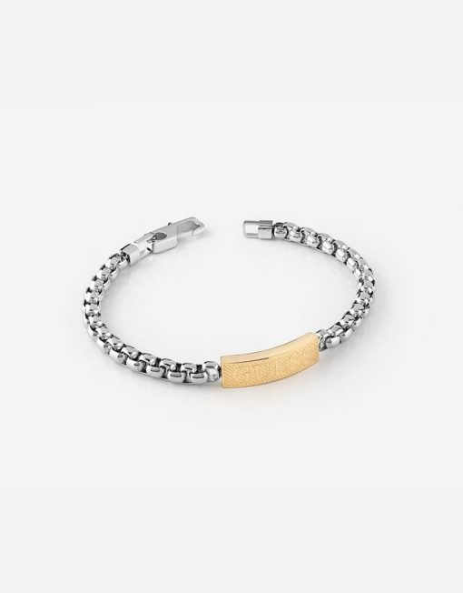 Pulsera de acero chapado. Estructura rígida cerrada de banda. Cadena tallada en forma de diamante. Placa central con detalle inscripción logotipo. Cierre con mosquetón.