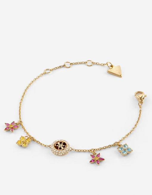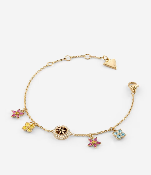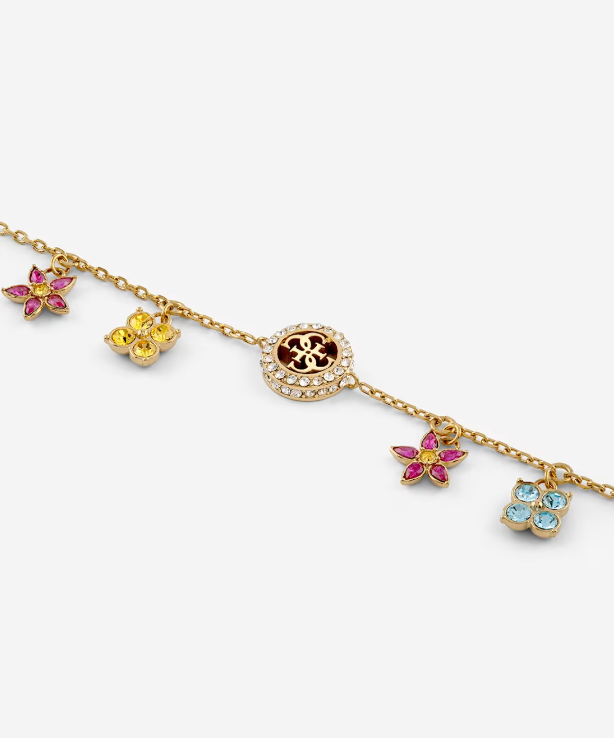 Pulsera de acero inoxidable. Estructura de cadena. Encantos de flores. Apliques de cristales y circonitas cúbicas. Cierre de langosta.