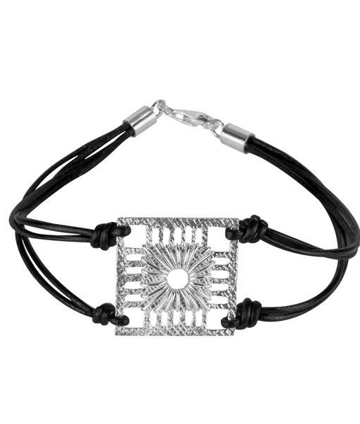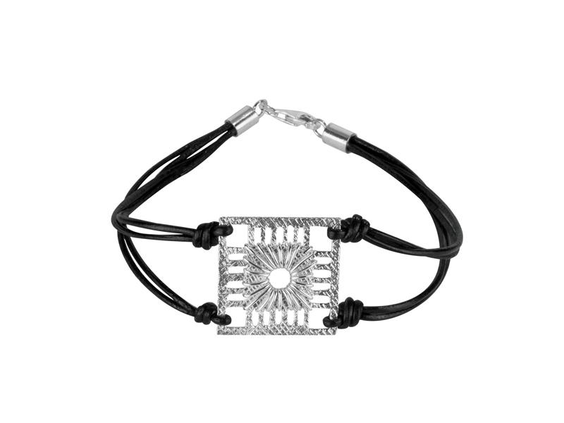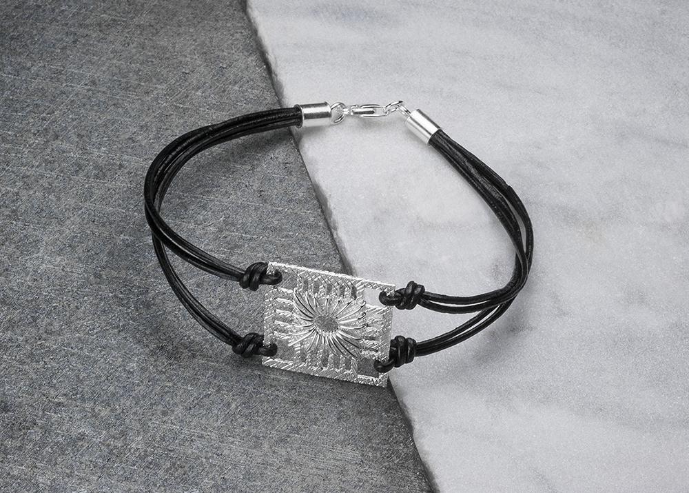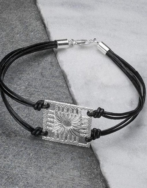 Pieza de fundición de plata de 925" con textura de lino y motivo realizado manualmente con hilo de plata y cadena realizada en cuero.