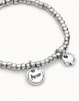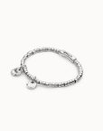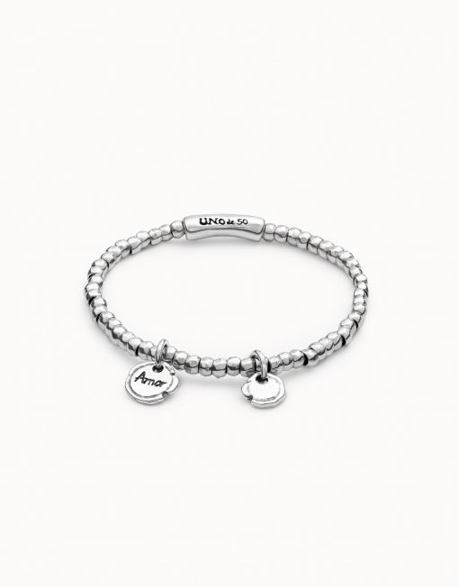 Esta pulsera de cuentas pequeñas bañadas en plata incorpora dos charms con acabado artesanal: uno grabado con la palabra Amor y otro en forma de corazón irregular.